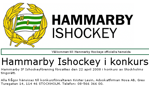 Den 22:a april 2008 försätts Hammarby Hockey i konkurs, man klarar helt enkelt inte av att betala ut löner och avgrunden är nådd. Dessutom hade man åkt ur allsvenskan när man inte ens ställde upp i kvalet samma säsong, förmodligen av ekonominska skäl. Men i stället för att gräva ner huvudet, dricka ljummen öl och dränka sina sorger så valde man att börja om. Börja om utan skulder och med i alla fall några kronor på kontot.